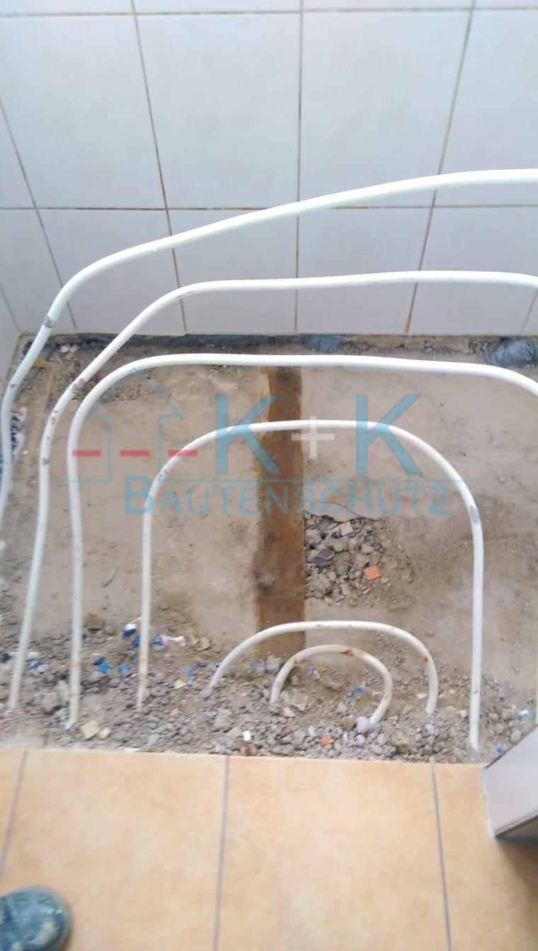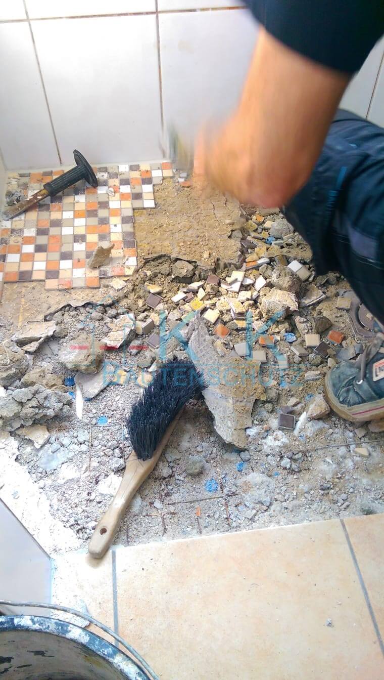 Beim Rückbau wurde der Deckenbereich geöffnet. Um die Fußbodenheizung zu entfernen musste der Boden geöffnet werden. Der komplette Duschbereich wurde wegen der technischen Trocknung herausgenommen .